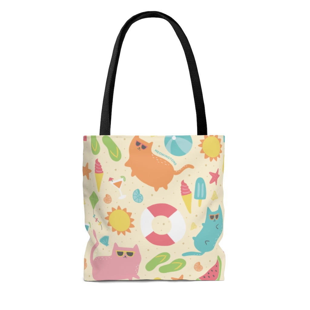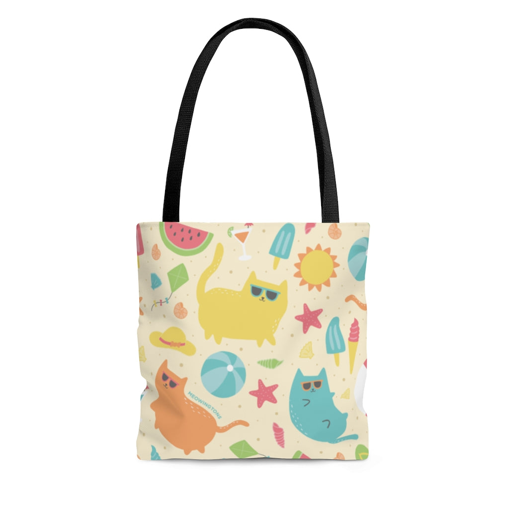 Whether you are headed to the beach, pool, or just to pick up some groceries, the Beach Cats Tote Bag has you covered. Available in three sizes to suit any need and boxed corners for easy stand up, you can pack up this adorable beach tote bag with all your summer trip essentials. Each cat tote bag features a bright, cheery pastel cat print, a bevy of beach-going, sunbathing cats that will have you in a summertime state of mind in no time!