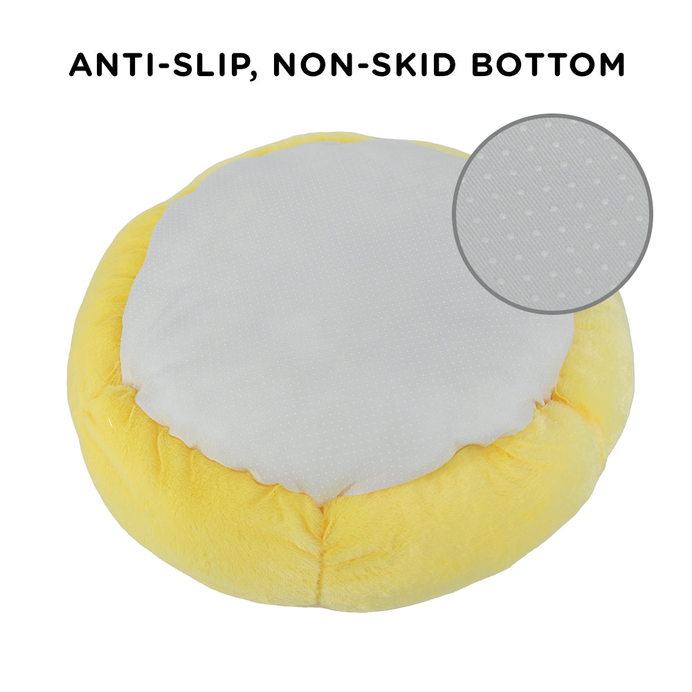 Crafted from silky soft vegan faux fur, your cat will feel as cozy as can be nestled in this adorable sunny cat bed. The bolstered sides (double as rays of the sun) offer extra support and a comfortable headrest. And when your pet sinks into the premium hypoallergenic poly-fill stuffing? The raised sides provide a comforting anti-anxiety "nest" for your pet to cuddle up in, be they a cat or small dog.
