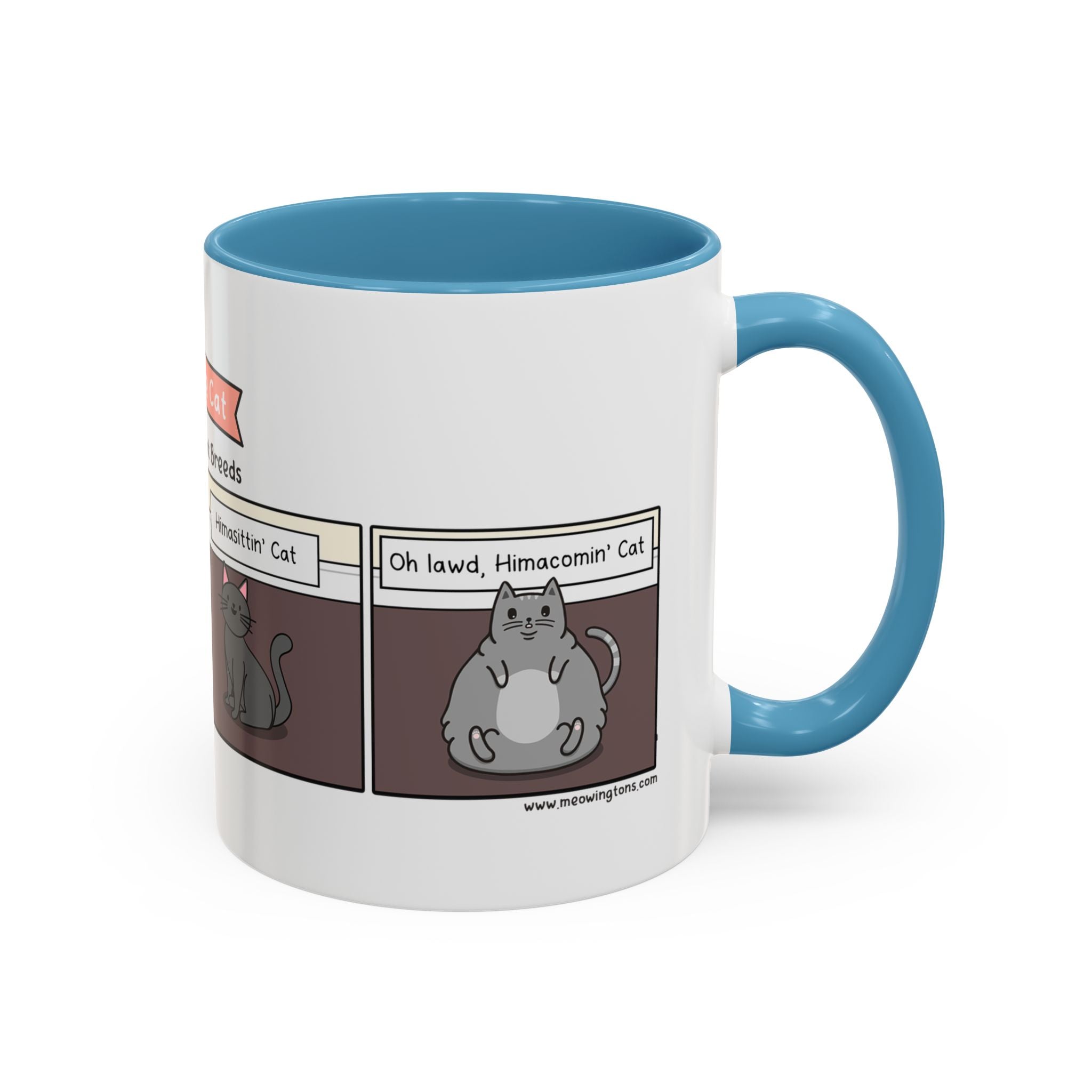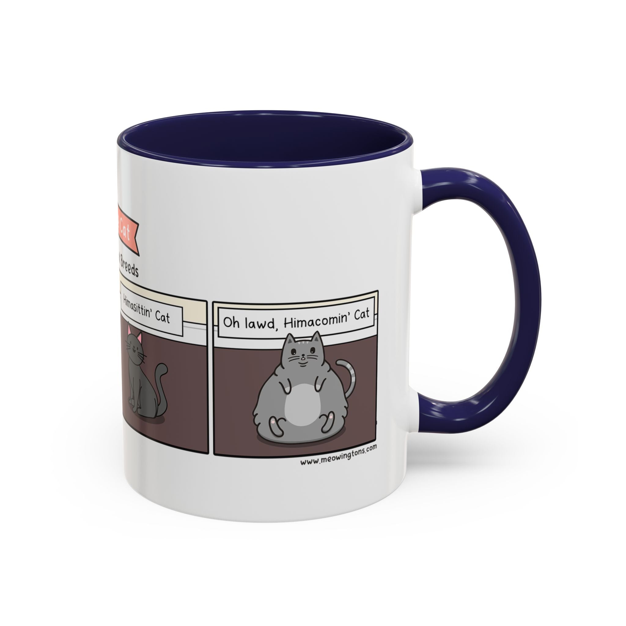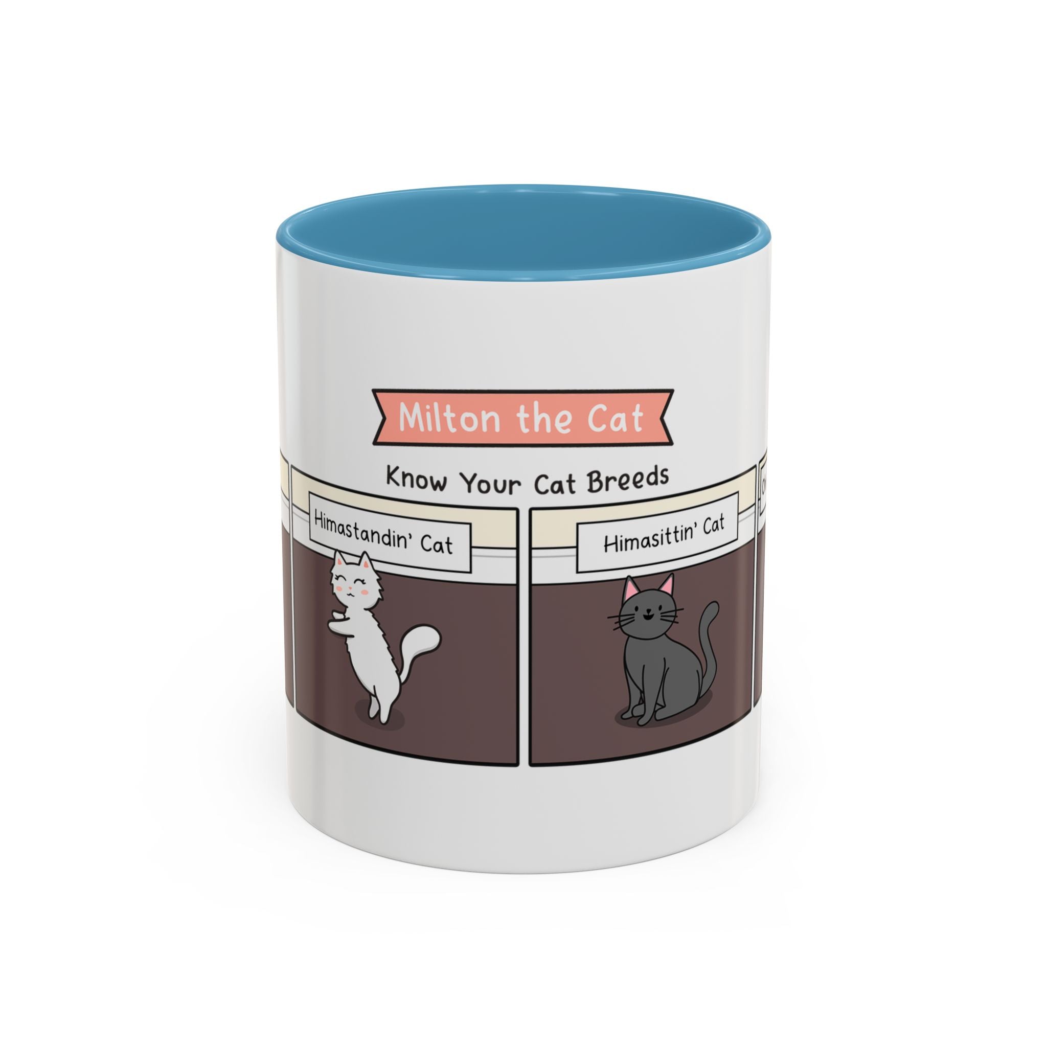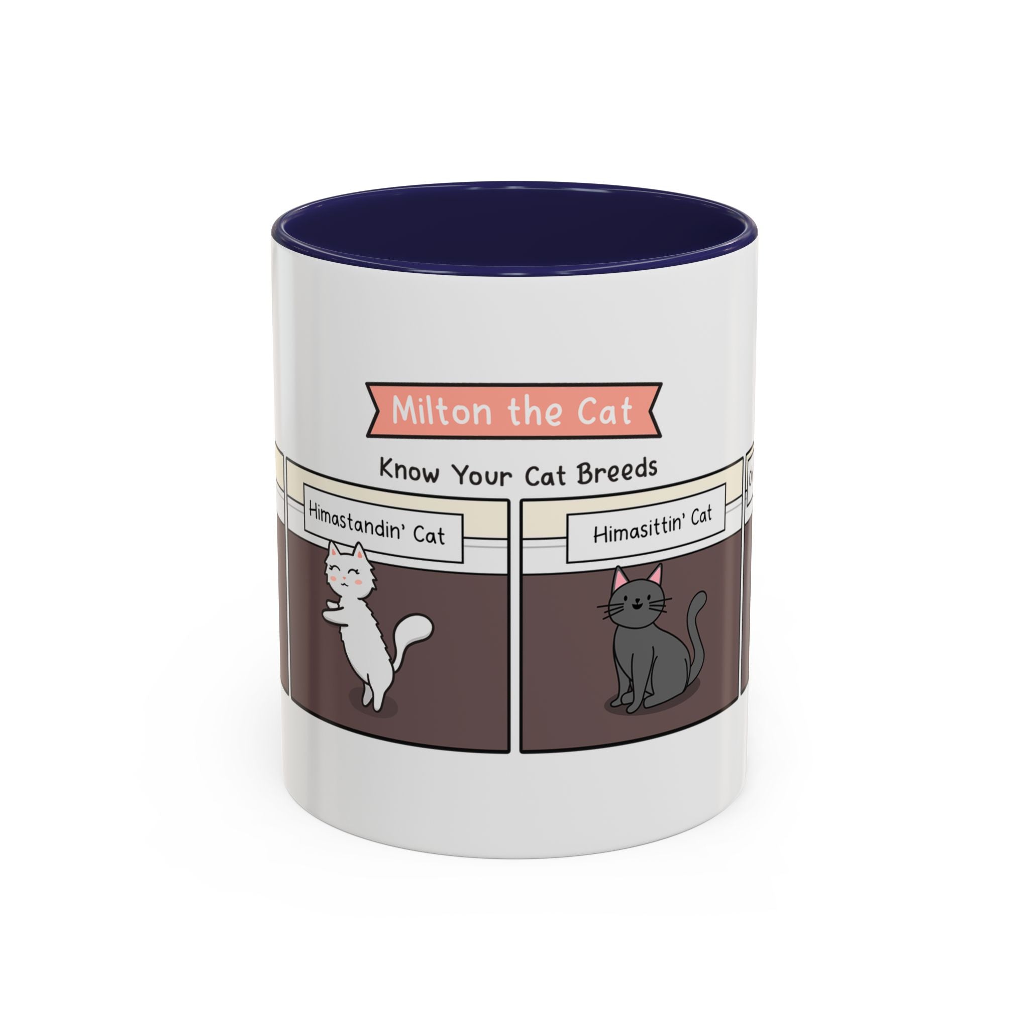 The Know Your Cat Breeds Cat Comic Coffee Mug is available in the following options: 11oz / Navy, 11oz / Pink, 11oz / Light Blue. Check the product page for current stock availability.