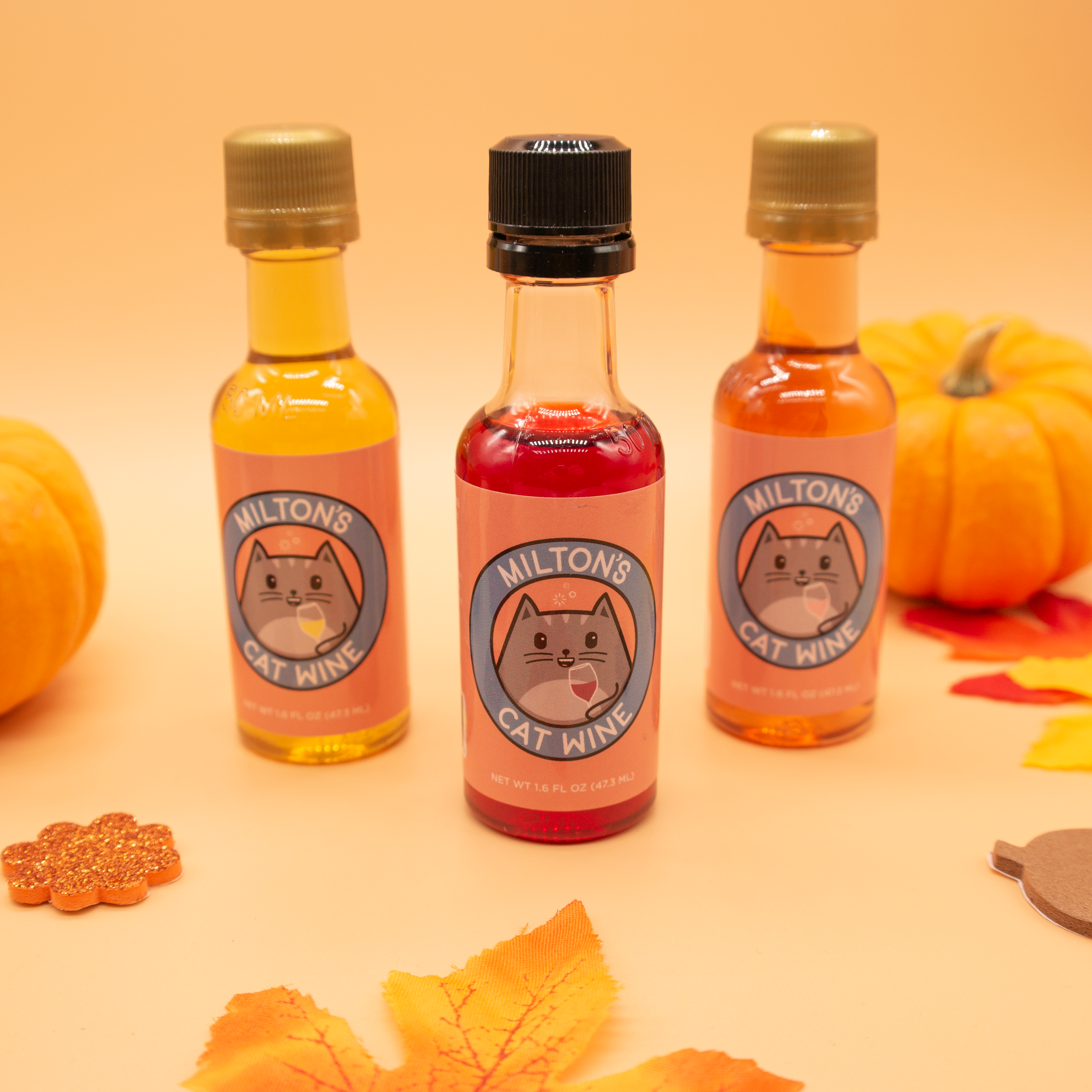 NEW FORMULA! Fill up your kitty's cup with a bit of fine catnip-infused cat wine. Milton's Cat Wine Pawty Pack is non-alcoholic and made only with organic ingredients right here in the USA. Each Pawty Pack contains 3 bottles of Milton's Cat Wine: a red Mewlot, a yellow Meowscato, and a pink Meowsé, just in case you don't know your cat's wine preference, or what pairs best with their wet food paté this evening.