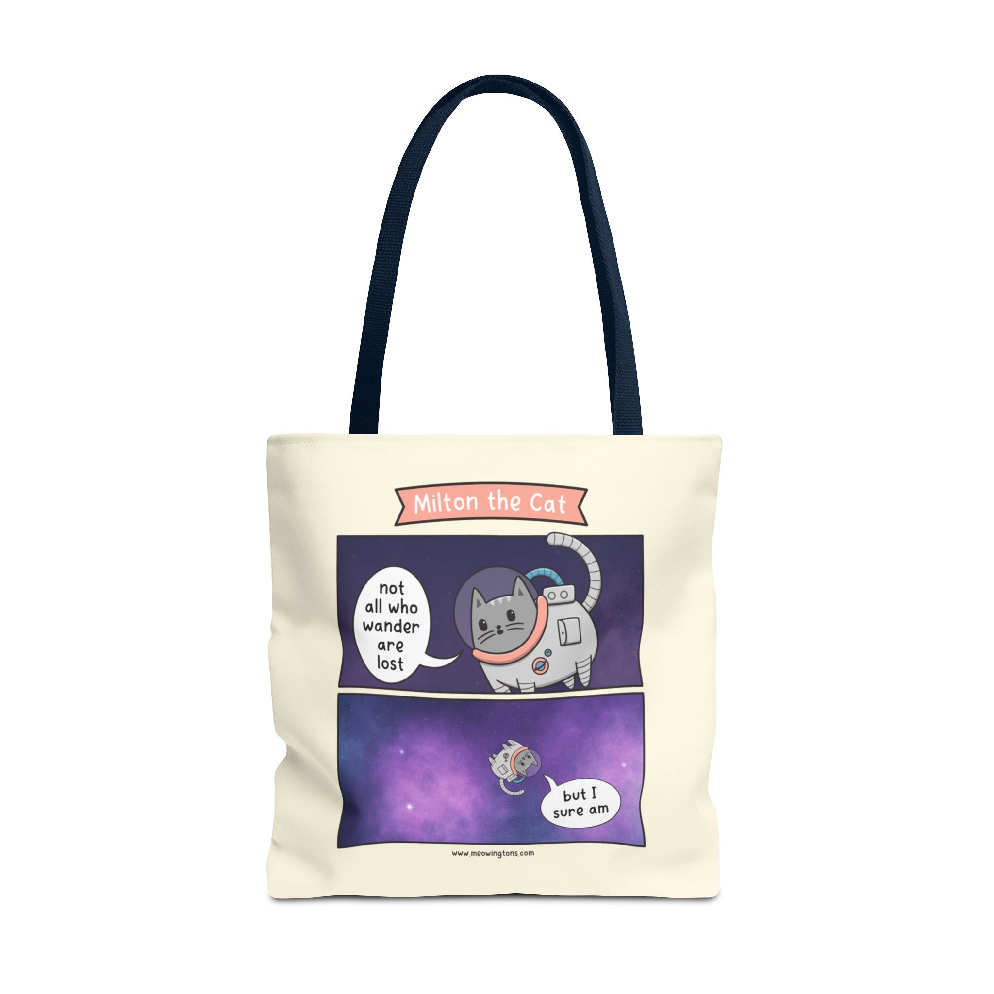 Introducing the Not All Who Wander Comic Tote Bag – a charming addition to our Milton the Cat Comic Collection, featuring everyone's favorite sassy tabby and his adorable sidekick, Millie. These two mischievous felines steal the show in our webcomic, Milton the Cat.