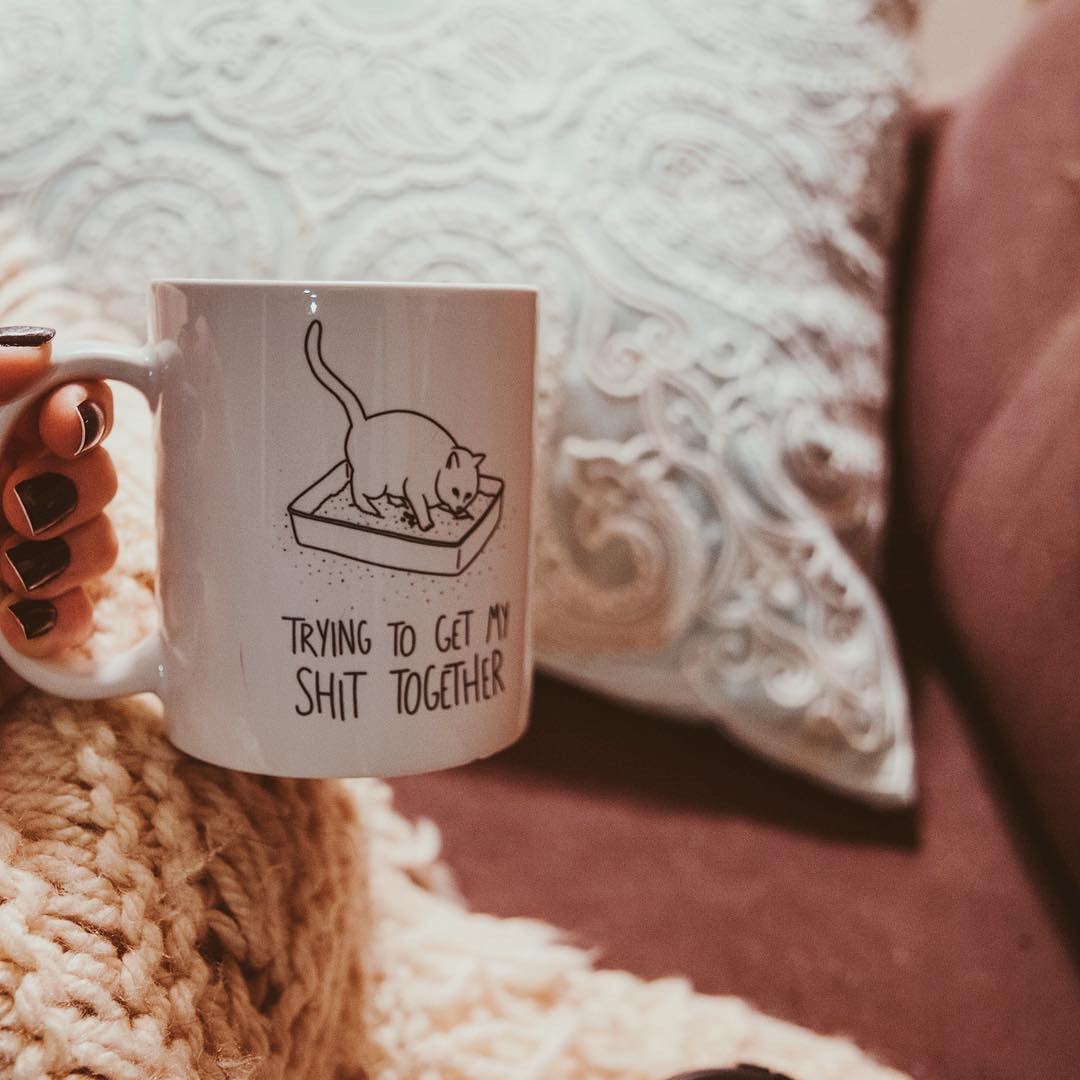 Featuring handwritten block lettering that says, “Trying to Get My Shit Together” paired with an illustration of a kitty burying their business in the litter box, this funny cat mug is guaranteed to start your morning off right. Crafted from durable white ceramic, this 11-ounce cat mug is ideal for your daily cup of coffee or tea; it’s the purrfect size to wrap your hands around on a cold morning … or when the thermostat at work is too low. Whether you’re looking for a new cat mug for the office or know a cat lover who needs to express their love of all things cat (even with all the cat hair), the Shit Together Cat Mug is the ideal selection.