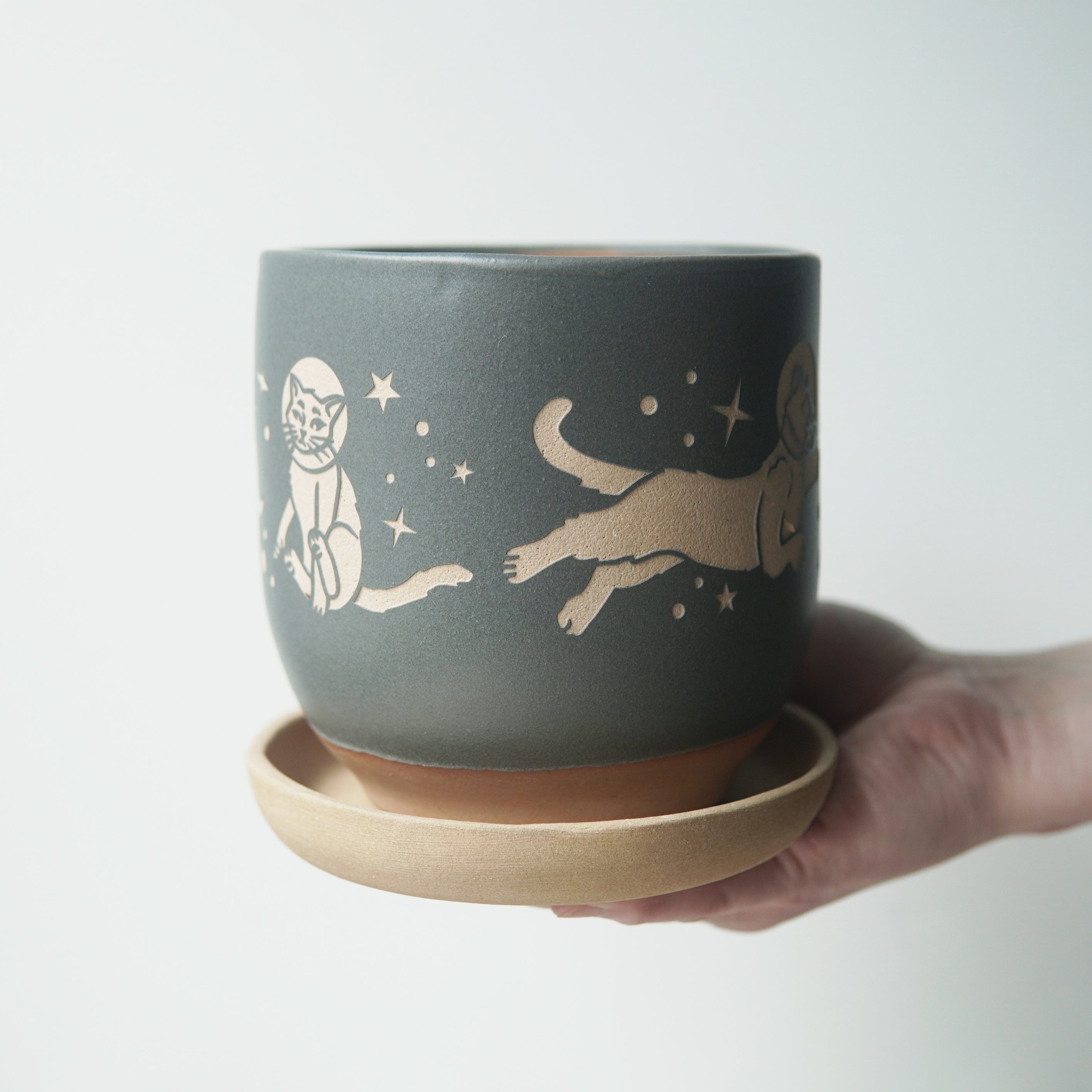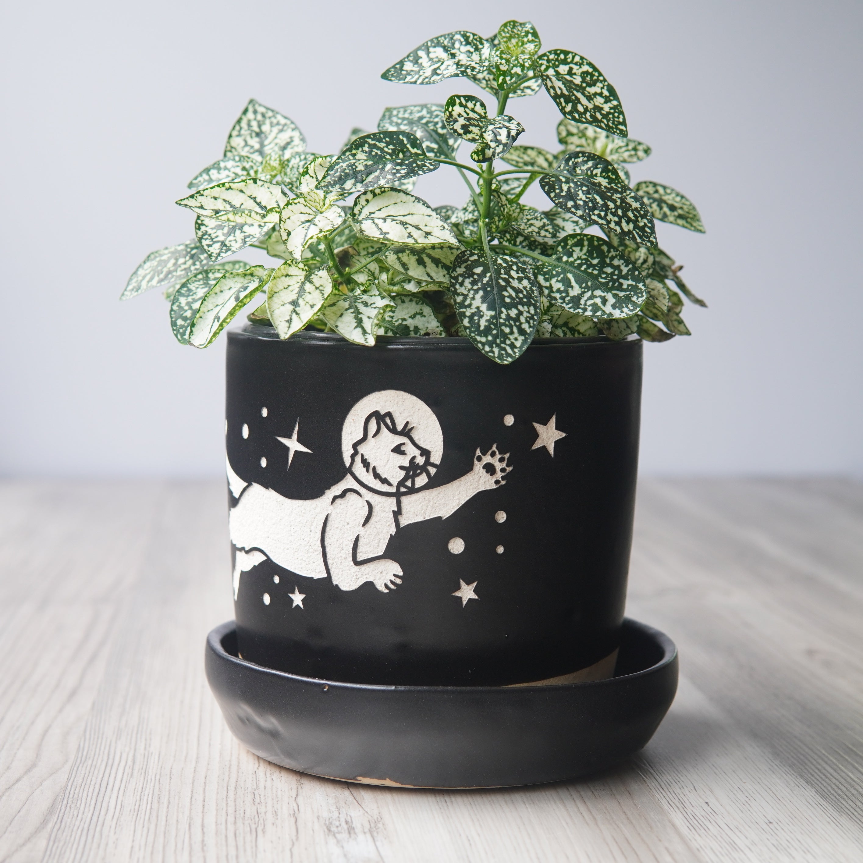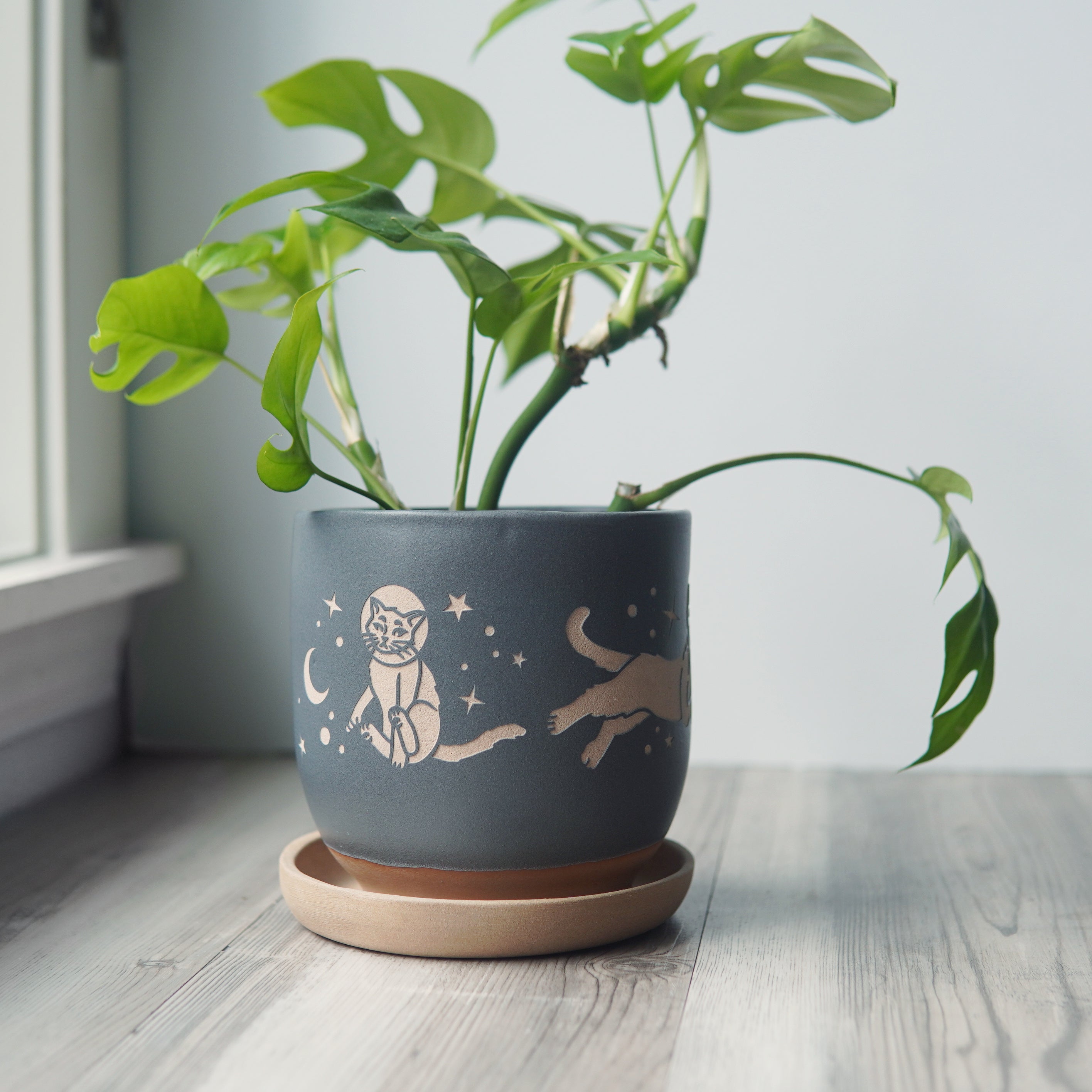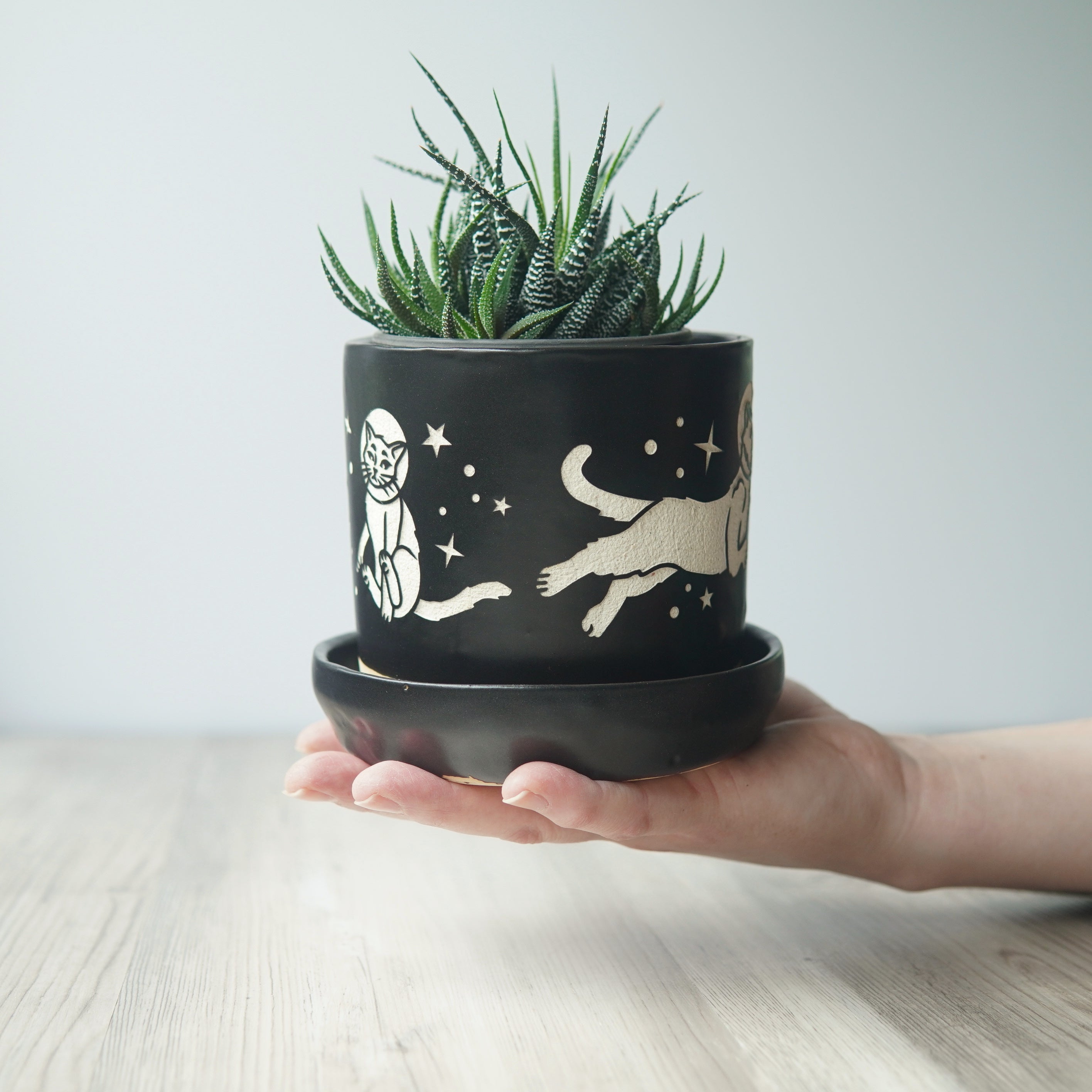 The Space Cats Farmhouse Planter with Saucer is available in the following options: 5" Pot / Black, 5" Pot / Cobalt Blue, 5" Pot / Gray, 4" Pot / Black, 4" Pot / Cobalt Blue, 4" Pot / Gray. Check the product page for current stock availability.